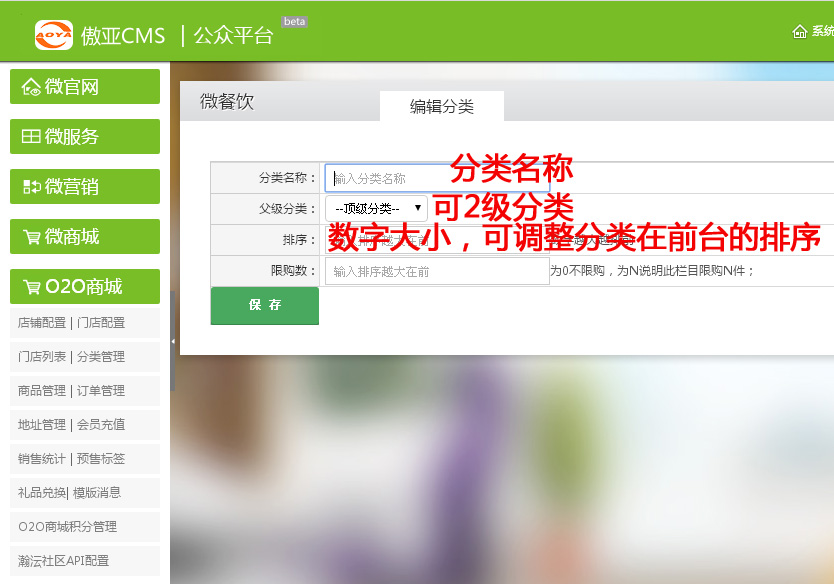 进入【傲亚后台】→【O2O商城】→【分类管理】→【分类管理】→【添加分类】