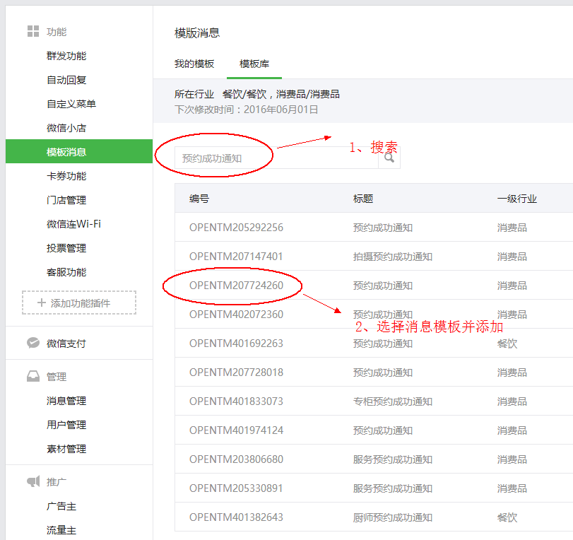 1、请在微信消息模版里搜索: “预约成功通知”;