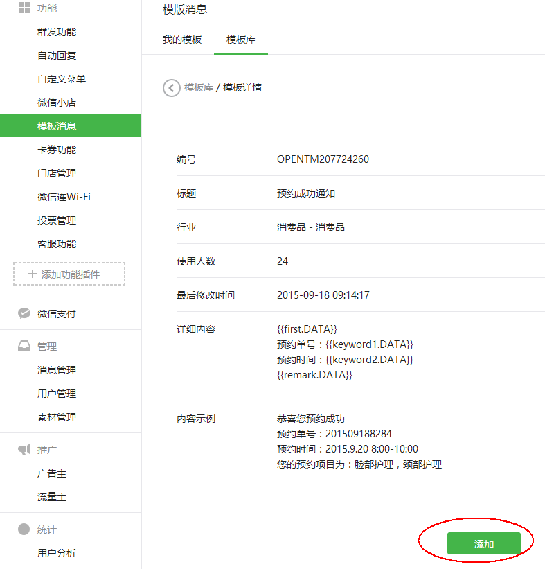 2、降“OPENTM207724260”添加到消息模版;