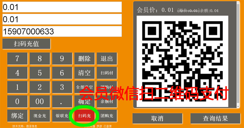 点扫码充——》输入充值金额——再次输入充值金额(两次必须一致)——》输入会员手机号(必填)——》充值——》
