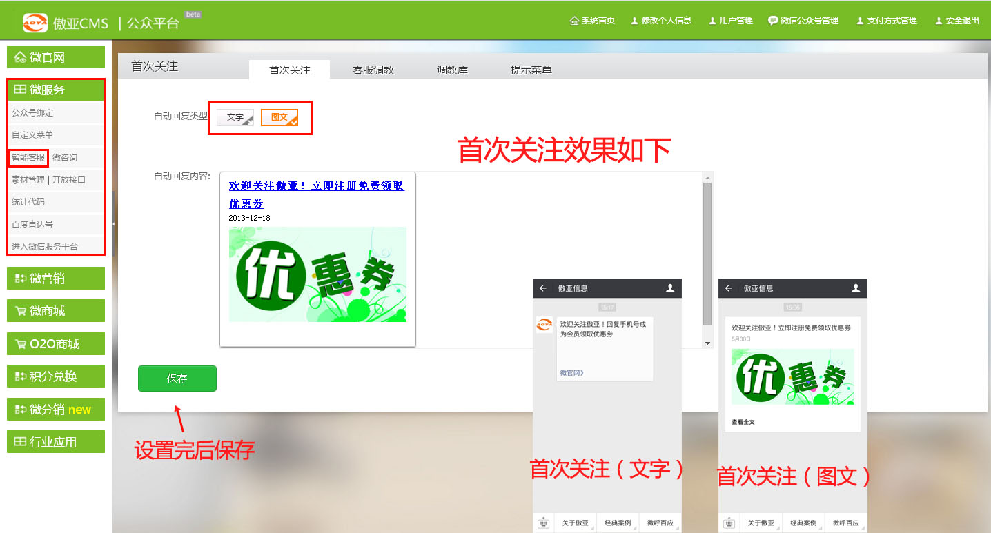 首次关注设置(图文请在素材管理设置)