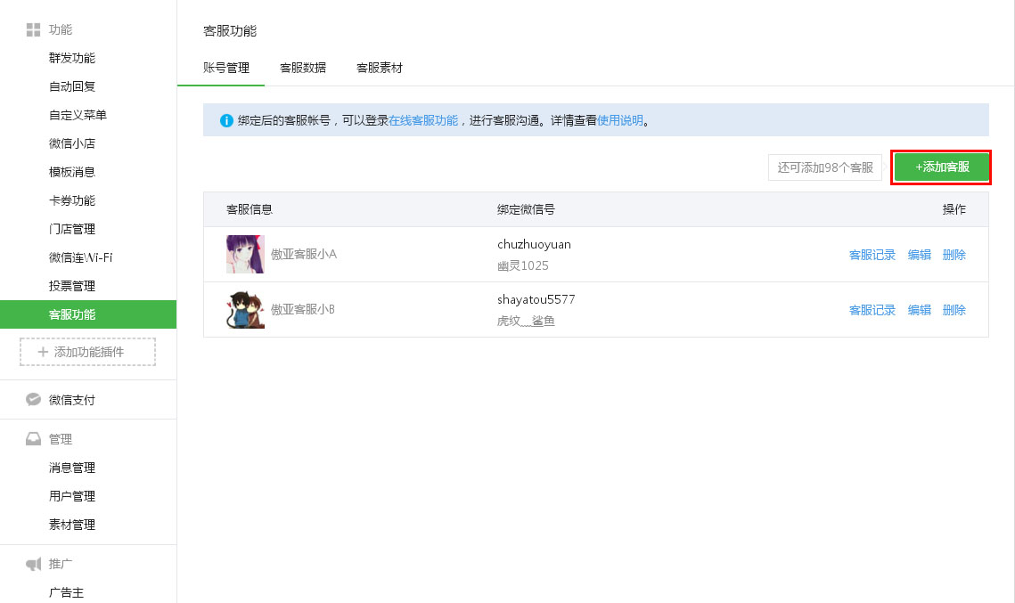 添加客服且绑定微信