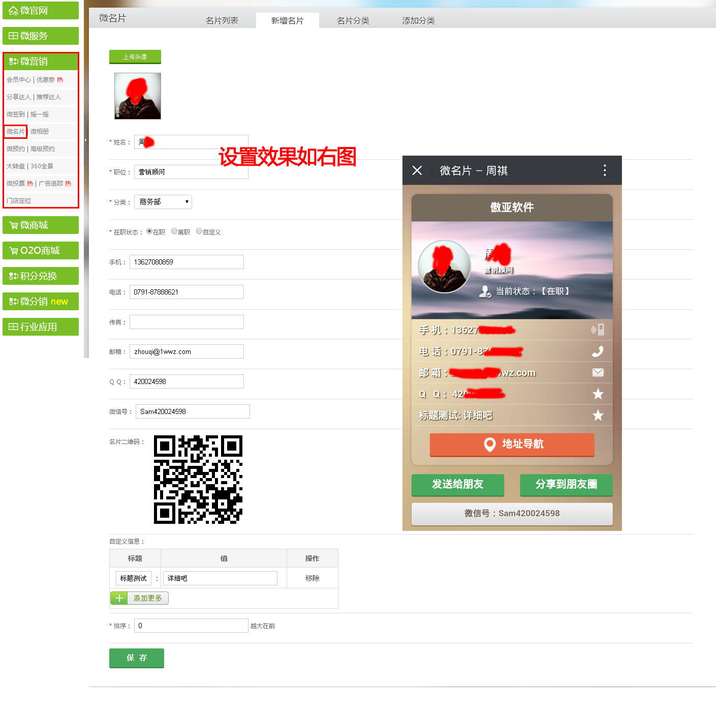 操作流程:点击微名片—>新增名片—>上传头像,根据提示内容填写完以后保存即可,保存后会生成一个二维码
