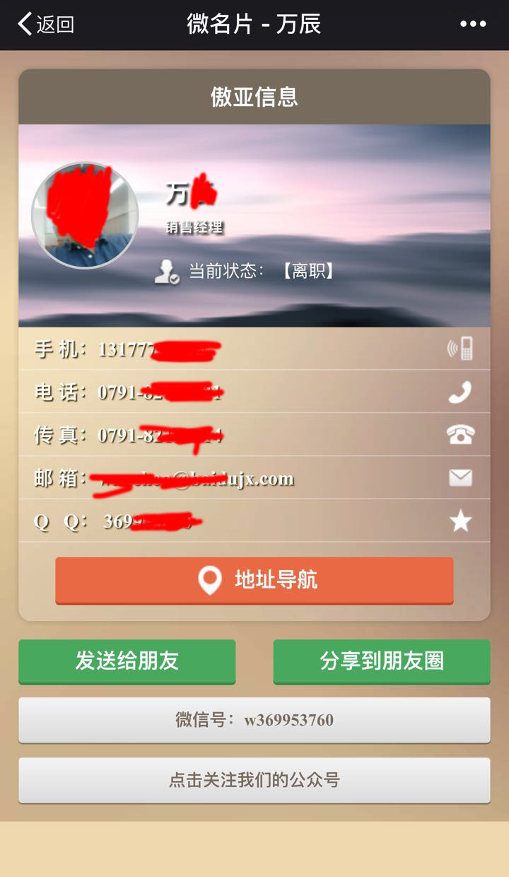 (2)进入企业微信公众号,可查询企业员工名片信息、在职状态等,可认证该员工是否为企业员工。从而提高企业公信力、以及服务能力。