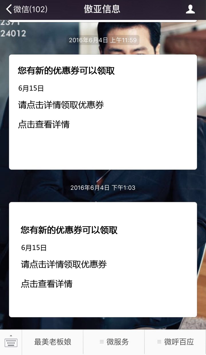所有关注了“傲亚信息”的粉丝,我们可以用消息模板点对点推送优惠券给粉丝。粉丝直接收到微信消息提醒。