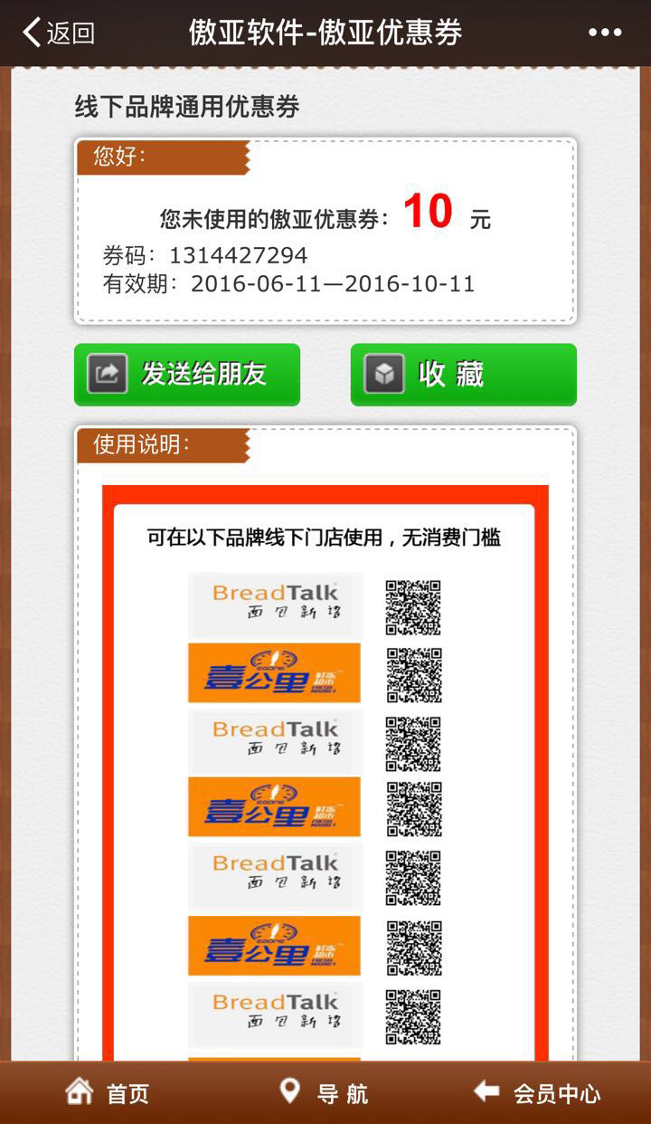 优惠券领取成功后,可以直接在会员中心查看。凭优惠券上的十位券码,在线下门店直接使用。