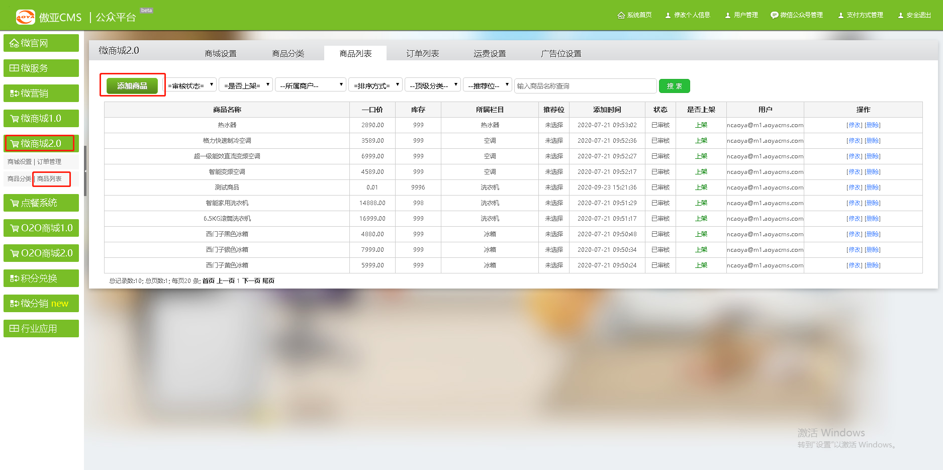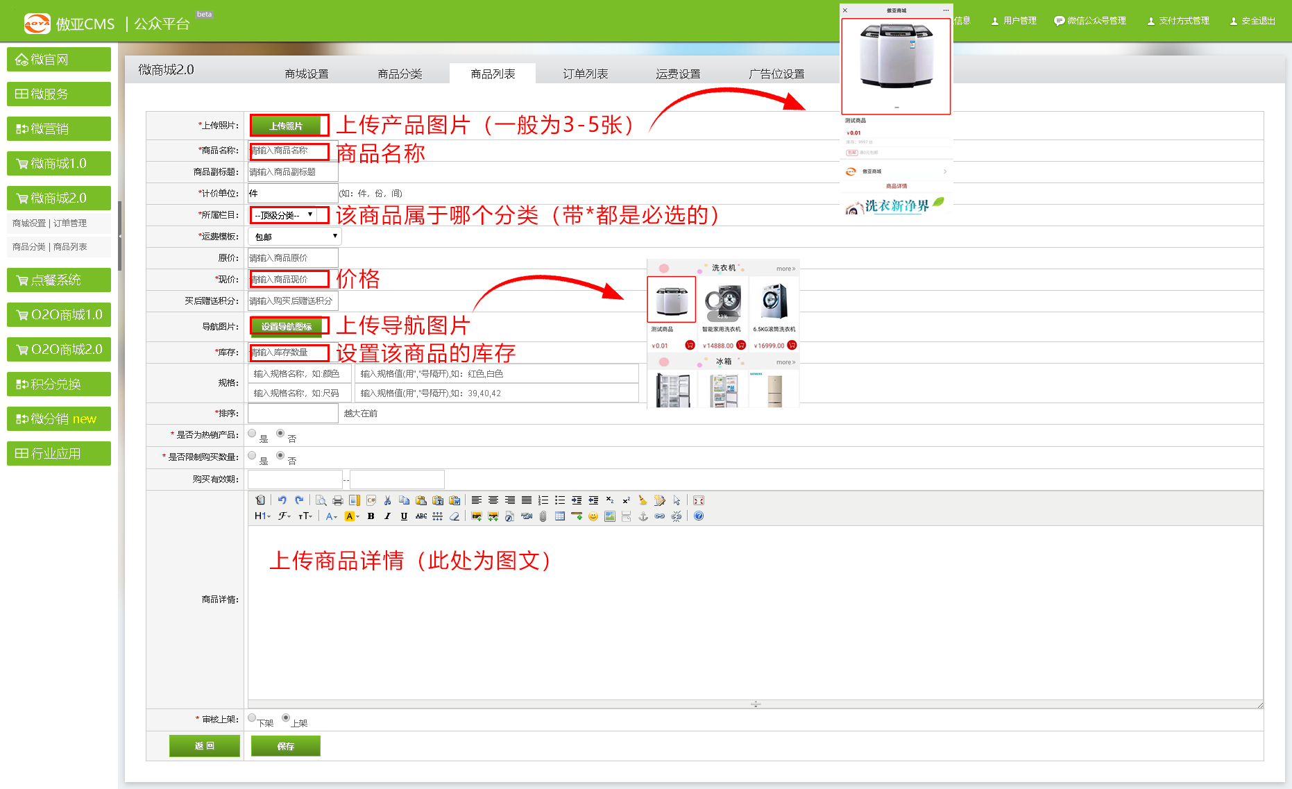 进入【微站点后台】→【微商城2.0】→【商品管理】→【添加商品】
