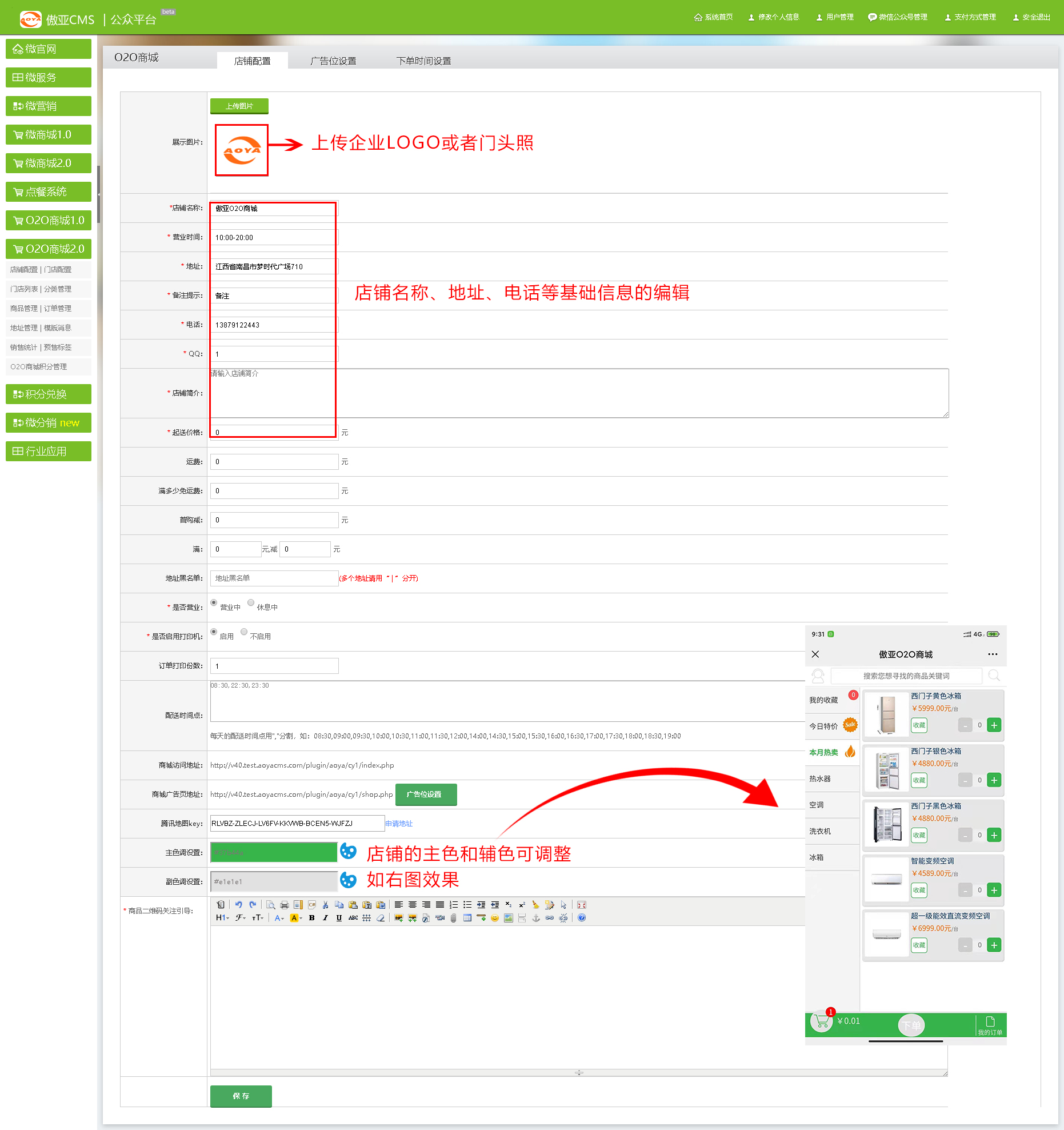 进入【傲亚后台】→【O2O商城】→【店铺配置】